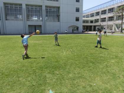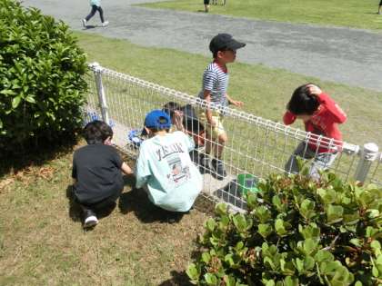 職員室前の芝生では、2年生が虫とりをしています。バッタを見つけたと言って、見せてくれました。地面に顔を近づけ、夢中になって探しています。