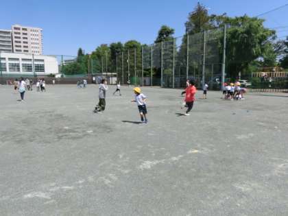 ボール遊び、おにごっこでたくさんの人が遊んでいます。
