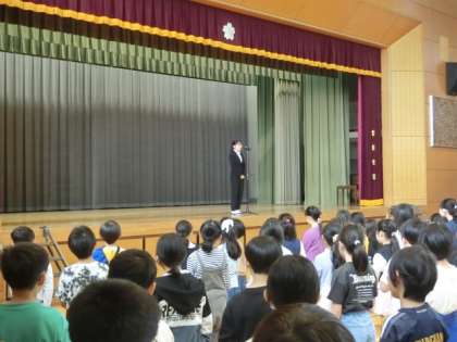 今日は月曜日、全校朝会があります。雨のため、体育館で行いました。