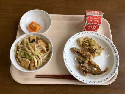 牛乳・きつねうどん・ししゃものごまフライ・キャベツの乾物和え・果物