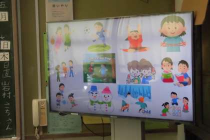 4年生は外国語の授業です。様々な遊びについて、英語での言い方を学習していました。友達が引いたカードに何の遊びがかかれているかを英語で言い当てるゲームで盛り上がりました。