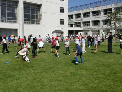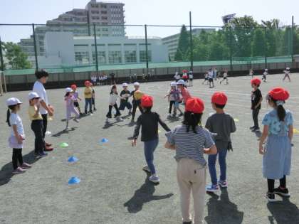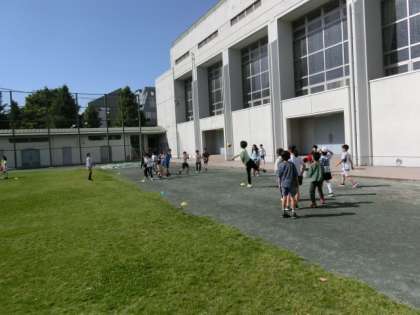 校庭に子どもたちが出てきました。早くから校庭に出てきてドッジボールのコートをとっているクラスもあります。ドッジボールが楽しみなのでしょう。