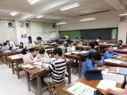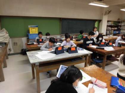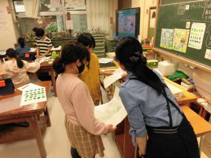 5年生の授業は図工です。「ルソー的なジャングルには」と題して、ルソーをイメージしたジャングルを描き、それをもとに作品を作っていきます。子どもたちの描いているジャングルを見ると、自分の好きなものをモチーフにしてルソーのようにデザインがされています。見ていて楽しくなる作品です。