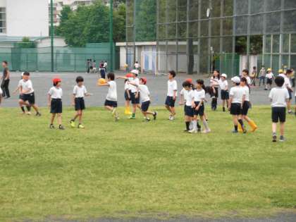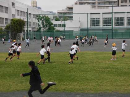 校庭で遊ぶことができるとの放送があり、子どもたちは大喜びで校庭に出てきました。