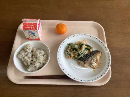 牛乳・ゆかりご飯・魚の生姜風味焼き・春野菜とわかめのサラダ・冷凍みかん