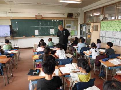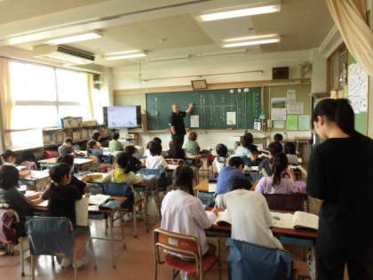 教育実習生の先生が子どもたちのノートを見て回っています。
