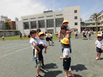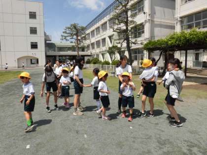 中休み、6年生のところに1年生が集まってきます。1年生は6年生のことが大好きです。6年生も手をつないであげたり、抱っこしてあげたりしています。自分もそうやって遊んでもらったことがあるのでしょうね。
