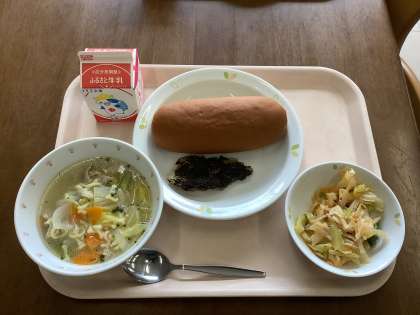 牛乳・コーヒーパン・魚のバジルソース焼き・イタリアンサラダ・ABCスープ