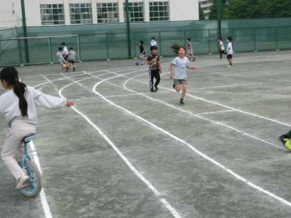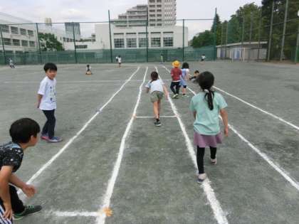 運動会のためにひいてあるラインを使って子どもたちがかけっこをしています。