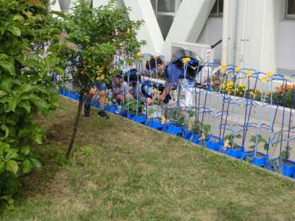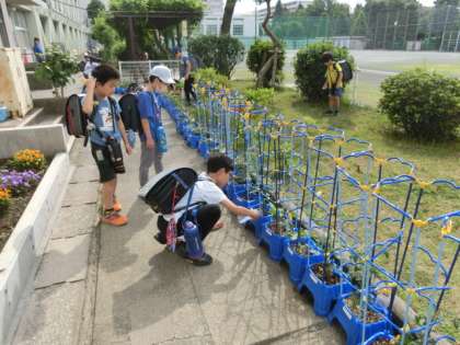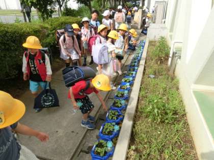 早く登校してきた1年生や2年生は、育てているアサガオや野菜たちに水をあげています。