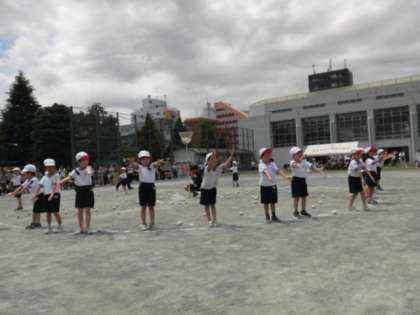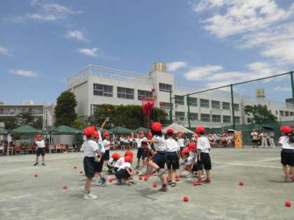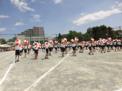 1年生の団体競技は「アロハ・デ・玉入れ」です。アロハを踊る途中で、玉入れが始まります。1年生のアロハの踊りは、とてもかわいらしいです。
