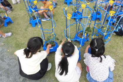 自分が育てている植物の茎を植木鉢の支柱にくくり付けていました。