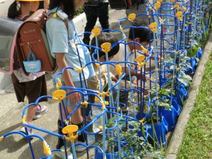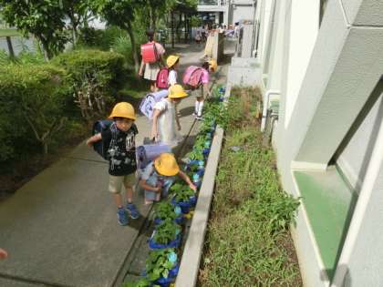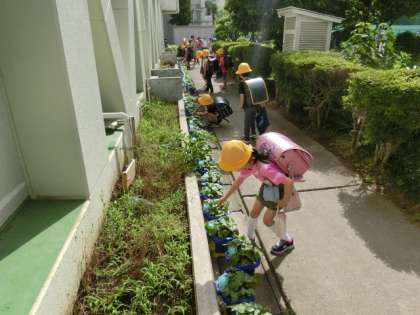 早く登校した1年生2年生は育てているアサガオや野菜に水をあげています。