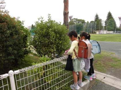早く登校した人が、キンカンの葉をながめています。何をしているのか聞いてみると、アゲハチョウの幼虫を探しているとのことです。アゲハチョウの幼虫に関心のある人がたくさんいます。アゲハチョウの幼虫を飼っているクラスもたくさんあります。