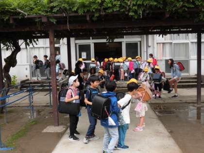 1年生2年生の昇降口では、早く来た人たちで集まって話をしています。