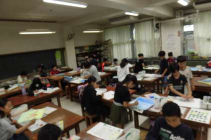 5年生は図工です。自分のイメージしたジャングルを描き、その中に好きな動物を加えていました。ローラーを使って色をぼかしたり、細かい部分を丁寧に塗ったりして個性あふれる作品となっています。完成が待ち遠しいです。