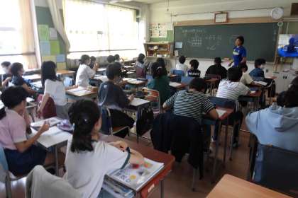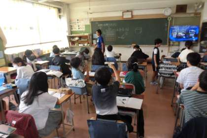 分数×分数について、出した答えの意味について考えていました。面積図を利用して自分たちの考えを説明しました。友達の考えをグループで再確認して理解を深めていました。