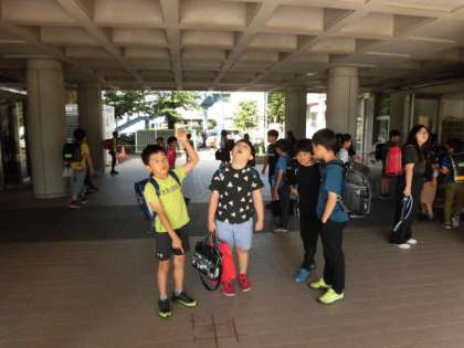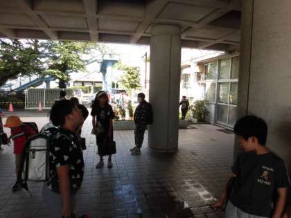 ピロティにいた人が上を見上げています。昨日の大雨のためか、上から水がしたたり落ちてきています。「雨漏りかなあ。」子どもたちは、気にしていくれています。