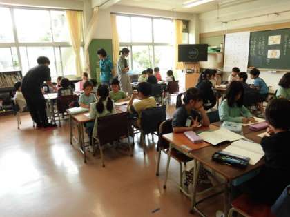 教科書の挿絵にあるきつねやたぬきをつかって、文をつくります。子どもたちは、それぞれ考えた文をつくり、ノートに書いていました。そのあと、グループでつくった文を紹介し合っていました。