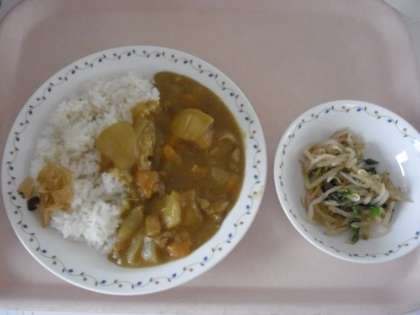 チキンカレーライス 牛乳 福神漬け もやしのごま風味