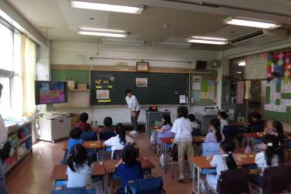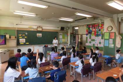 1年生は算数の学習でした。足し算がどのような場面で使われているのかを考えていました。ブロックで問題を再現して式を立てたり、答えを出したりしました。