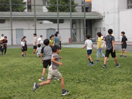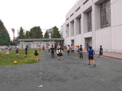 また、6年生が4年生とドッジボールをしています。6年生は、5年生の時にいつもこの場所でドッジボールをしていました。下の学年の人とのドッジボールとてもいいですね。