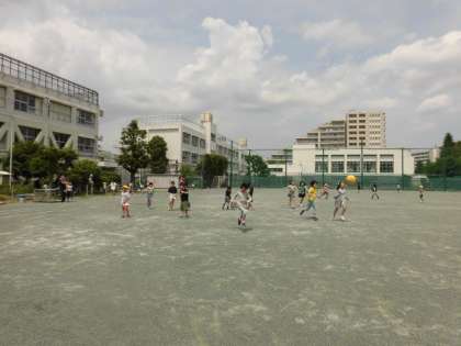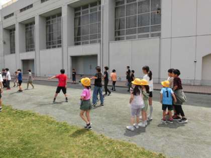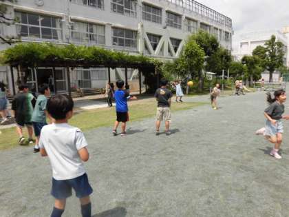 6年生がドッジボールをしています。今度は、そこに1年生も混ざっています。1年生には、ゆっくりしたボールを投げたり、後ろにかくまってあげたりしている6年生。
