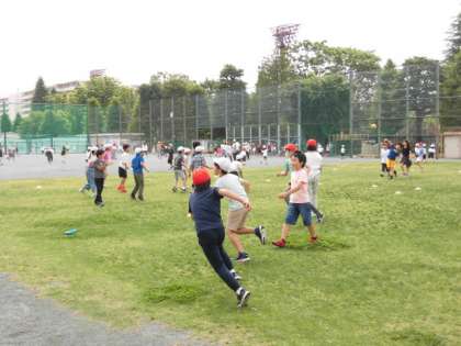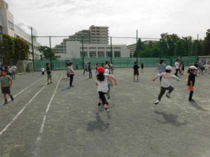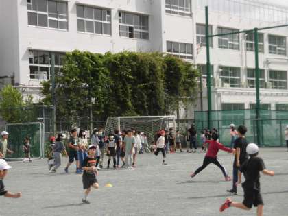 全校のみんなが校庭に出てきています。クラスで考えた遊びをしています。校庭のあちらこちらで走り回っている人がいます。子どもたちはみんな朝からとても元気です。