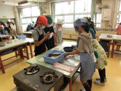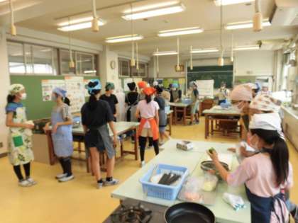 つくるものは、「いろどり炒め」です。ピーマン、ニンジンなどの野菜を洗い、包丁で切っています。手際のいい人がいます。きっと、家で料理の手伝いをしているのでしょう。自分たちで作ったものは、美味しいと思います。みんなで楽しんで食べてください。