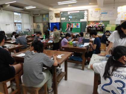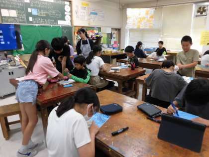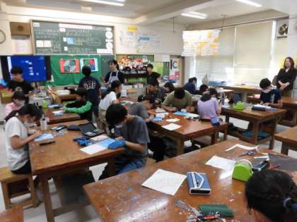 子どもたちは、板を支える指に気を付けてながら彫刻刀を動かしていました。