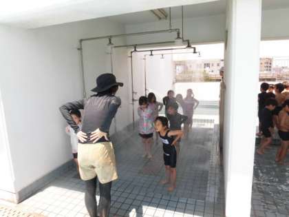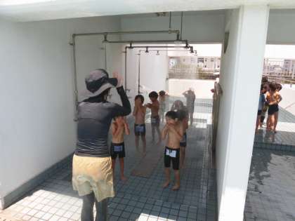 プール開きの会のあと、準備運動をしてシャワーを浴びます。今日は暑いとはいっても、6月のシャワーは冷たく感じるのでしょう。子どもたちからは、自然と声があがりました。冷たさを我慢している1年生の顔もとてもかわいらしかったです。