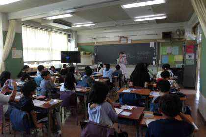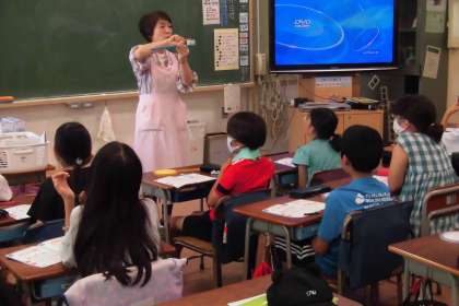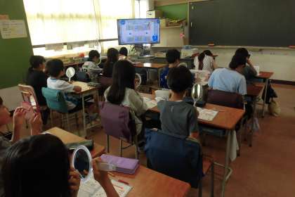 歯肉炎になっている子どもの割合が40%以上だと知ると、「えーっ!」と驚きの声をあげていました。歯肉炎のサインが、「色」「形」「硬さ」「出血」であることを知り、鏡を使って自分の歯ぐきを一生懸命チェックしていました。