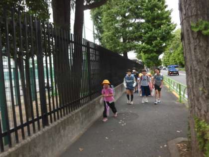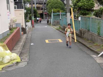 子どもたちの登校する時刻です。今日のお天気は曇りですが、むしむしする朝です。