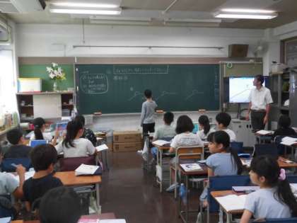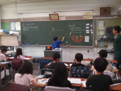 180度を超える角度は、どのようにしてはかるのかを考えています。考え方をみんなの前に出て説明をしています。