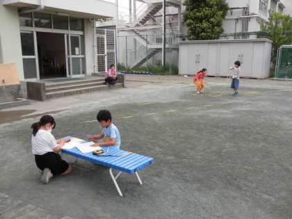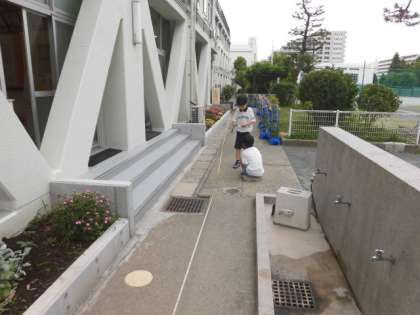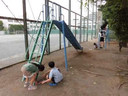 校庭を見てみると、3年生がメジャーを持って校庭にあるいろいろなものの長さをはかっています。長さの学習のようです。鉄棒の高さ、犬走の長さ、うんていの長さなど二人一組になってはかっています。はかり終わると、それを記録しています。