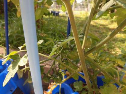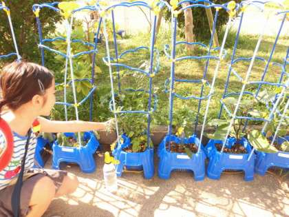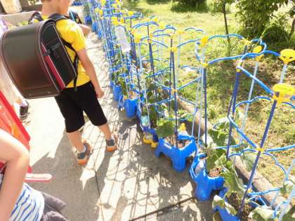「わたしのミニトマト、すごくたくさんなっているんだよ。」と声をかけてくれる人もいます。見にいくと、まだ赤くはなっていないのですが、確かにたくさん実がなっています。とてもうれしそうな顔をしています。