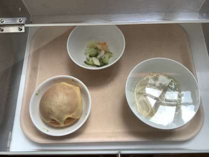 牛乳・ビスキーパン・ヌードルスープ・フレンチサラダ