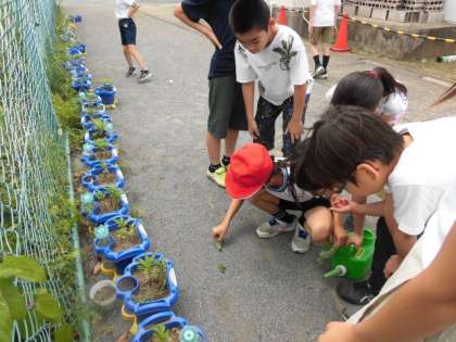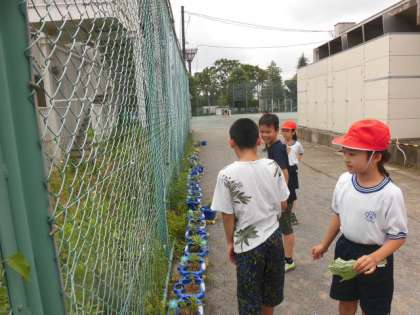 3年生が育てているホウセンカに虫がついています。3年生が虫がいることに気づき、とろうとしています。そこに4年生がやってきました。4年生は去年、ホウセンカを育てているときに、この虫に気づき、何度も退治していたのです。