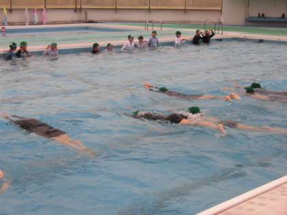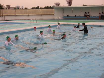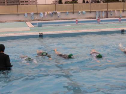 少したって様子を見に行くと、けのびの練習をしていました。二人一組で行っています。ペアで互いの動きを見合っています。