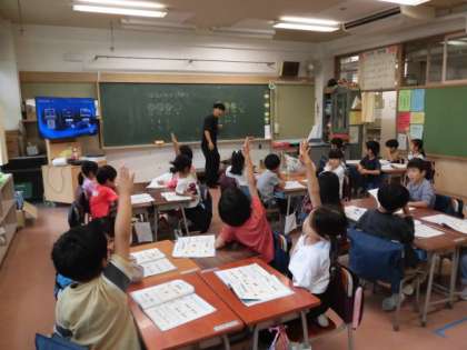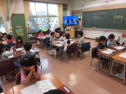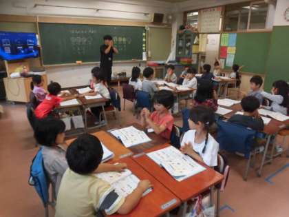1年生の授業は音楽です。リズム遊びをしています。「タン」と「タタ」のリズムを手拍子と言葉を交えて奏でています。3音と5音の言葉を当てはめることで、子どもたちはとても楽しそうにリズム遊びをしています。とてもいい表情をしている子どもたちです。