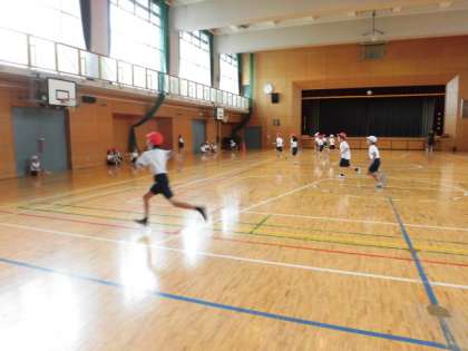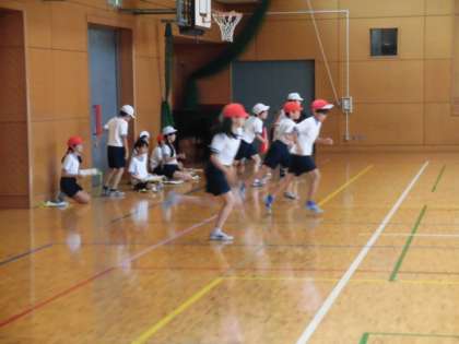 4年生の授業は体育です。体育館で体力テストのシャトルランを計測しています。