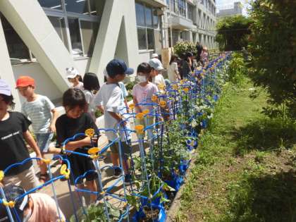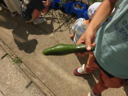 みんなで育てている野菜に水をあげるようです。朝早い時間でないと、水が温まってしまうからだそうです。大きく育った野菜を収穫する人もいます。