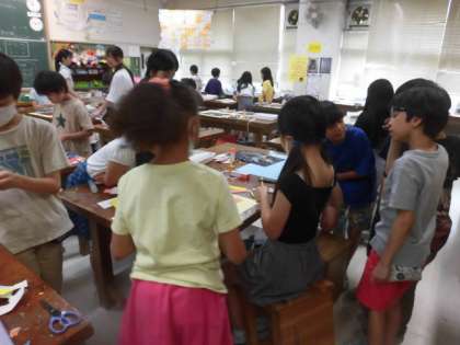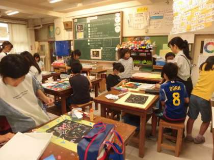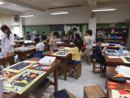 4年生の版画は、額縁のデザインも自分で考えて、いろいろな装飾を行っています。
