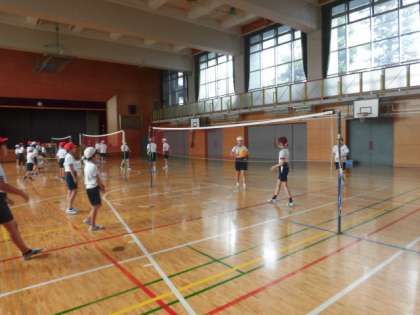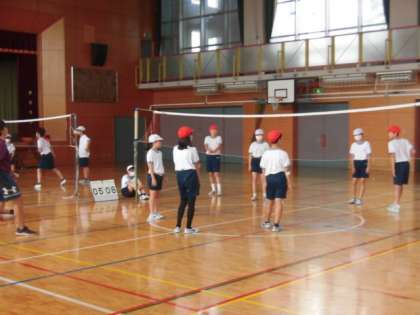 バレーボールのはじく動きは、子どもたちにはなじみのない動きなので、キャッチを取り入れ、バレーボールを行います。