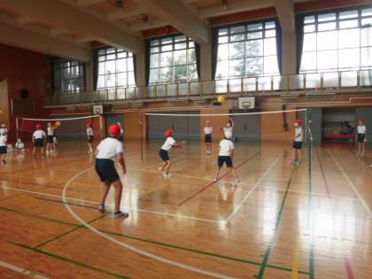 6年生の授業は体育です。体育館でキャッチバレーをやっています。