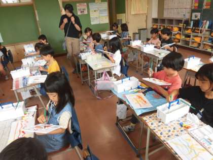 1年生の授業は図工です。絵の具を使っていろいろな線をかいています。