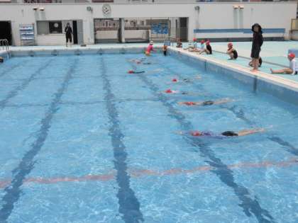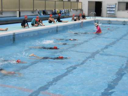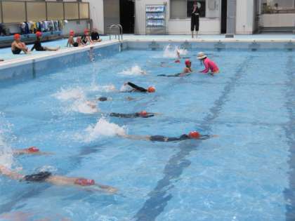 水の中で力を抜いて浮くこと、そして、けのび、バタ足など基礎的なことをひとつずつ行っています。