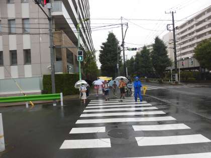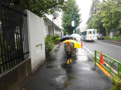 子どもたちは傘をさしての登校です。視界がよくないので、心配です。