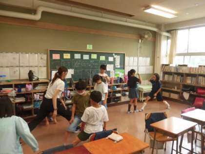 3年生は大学生ボランティアの先生と一緒に遊んでいました。体の柔らかさを競っているようでした。