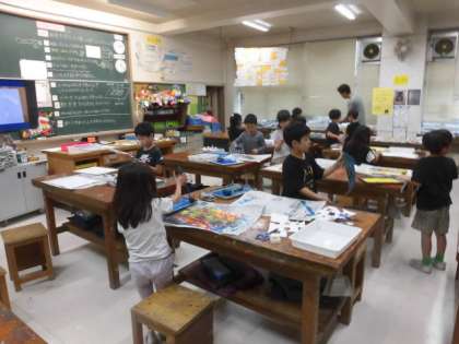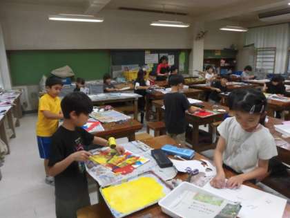 2年生の授業は図工です。版画の学習です。2年生の版画は紙版画です。